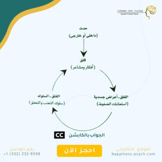 حدث أو موقف > يجعلنا نشعر بالقلق أو عدم الارتياح و تتابع الأفكار المقلقة > ينتج عنها أعراض جسدية مثل : ألم في الرأس، آلام في المعدة و القولون ..وغيرها > سلوكيات التجنب و القلق و التحقق للسعي نحو الإطمئنان.